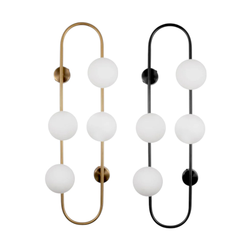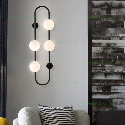 Aplica modernă pentru montaj pe perete este disponibilă în finisaj auriu sau negru și este echipată cu 4 globuri din plastic mate. Designul său geometric și echilibrat oferă un aspect elegant și contemporan, potrivit pentru diverse stiluri de amenajare interioară. Difuzoarele din plastic mat asigură o lumină difuză și plăcută, ideală pentru iluminarea ambientală. Este dotată cu fasunguri G9, compatibile cu becuri LED. Aplica se montează ușor pe perete și este ideală pentru living, hol, dormitor sau spații comerciale.