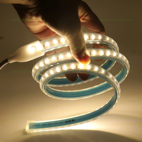 Noile Benzi LED cu alimentare directa la 220V sunt perfecte pentru orice aplicatie de exterior ce necesita o lumina accentuata pe lungimi mari, pana la 50m cu o singura alimentare, evitand astfel montarea mai multor surse ca in cazul benzilor de 12V. Benzile LED 2835 220V au 100 de LED-uri SMD per metru super luminoase si pot fi taiate din 10 in 10 led-uri, la multiplu de 10cm. De asemenea, alimentarea acestei benzi LED are un aspect nou si se face prin clipsare (se comanda separat).