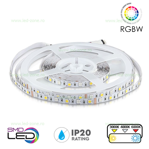 Utilizeaza cea mai versatila si atragatoare solutie de iluminat pentru proiectele tale ! Conecteaza aceasta banda la un controler RGBW si vei avea cele mai fascinante efecte de schimbare a culorii. Cu banda RGBW si controlerul atasat vei avea posibilitatea sa schimbi o varietate de culori uimitoare create din culorile rosu, verde si albastru, plus lumina alb cald sau alb rece. LED-Zone este mandru sa-ti ofere cea mai recenta tehnologie de iluminat cu LED-uri. Banda LED este cea mai noua solutie de iluminat disponibila si este deocamdata cel mai versatil produs al nostru. Suportul adeziv 3M este de inalta calitate si permite o instalare usoara a benzii pe orice suprafata plana.
