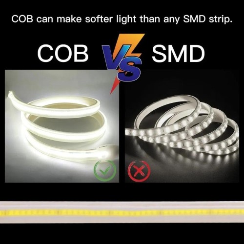 Noile Benzi LED COB cu alimentare la 220V sunt perfecte pentru orice aplicatie de exterior ce necesita o lumina accentuata pe lungimi mari, pana la 50m cu o singura alimentare, evitand astfel montarea mai multor surse ca in cazul benzilor de 12V. Benzile LED COB 220V au 288 LED-uri per metru si pot fi taiate la multiplu de 50cm. De asemenea, alimentarea acestei benzi LED are un aspect nou si se face prin clipsare (se comanda separat).