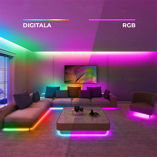 Utilizeaza cea mai versatila si atragatoare solutie de iluminat pentru proiectele tale! Noutatea benzilor digitale, in comparatie cu cele RGB, reprezinta multitudinea de culori pe un singur metru. La benzile rgb, se poate opta doar o singura culoare pentru toata banda. Banda are nevoie de controller pentru a functiona (se comanda separat).