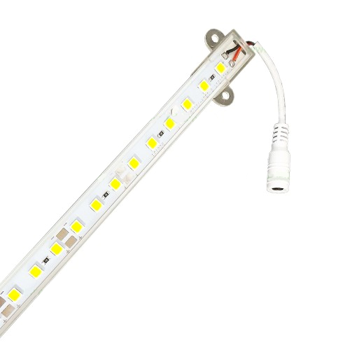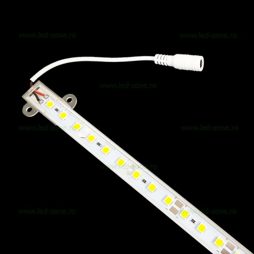 Banda LED rigida este prevazuta la capete cu cate un capac terminal cu doua orificii de prindere, iar corpul acesteia este incadrat de un profil de aluminiu. Taierea se va face cu o foarfeca de tabla in zona indicata. Banda este interconectabila datorita Mufelor DC 2.1mm (tata + mama).