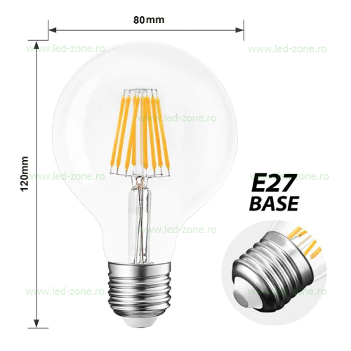 Descriere Bec LED E27 8W Filament Glob Clar G80