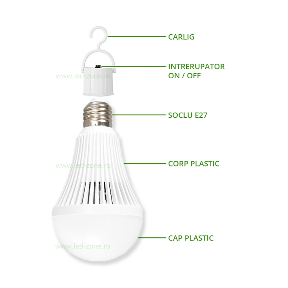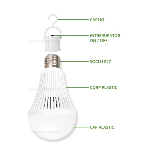 Becul LED cu acumulator are un flux luminos de 450 lm, iar durata medie de functionare este de aproximativ 25.000 ore. Acesta include capac cu intrerupator.