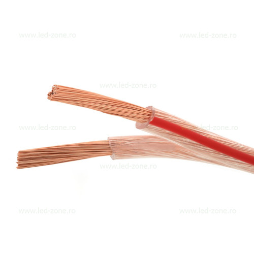 Cablu difuzor bifilar transparent 2x0.35mm, cu o linie rosie pe unul dintre fire.