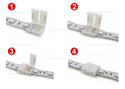 Conectorul este utilizat in aplicatii cu banda LED RGB interior, pentru imbinarea a 2 benzi.