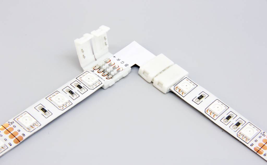 Conectorul este utilizat in aplicatii cu banda LED RGB interior, pentru unghiurile de 90 grade.