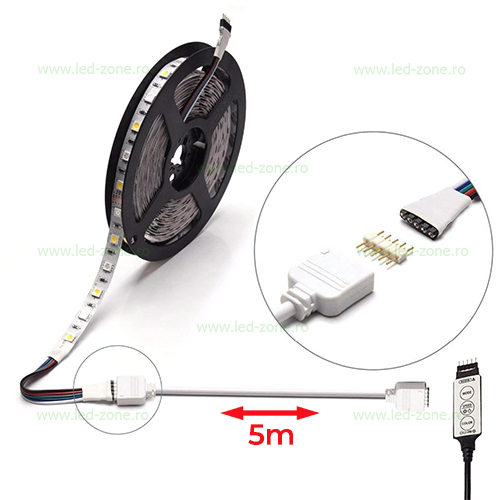 Conector folosit pentru prelungirea benzilor SMD 5050 RGBW din controller sau pentru a conecta doua benzi SMD 5050 RGBW intre ele (max. 10m) pentru a nu se pierde intensitatea spre sfarsitul benzii. Cablul are 5 metri lungime.