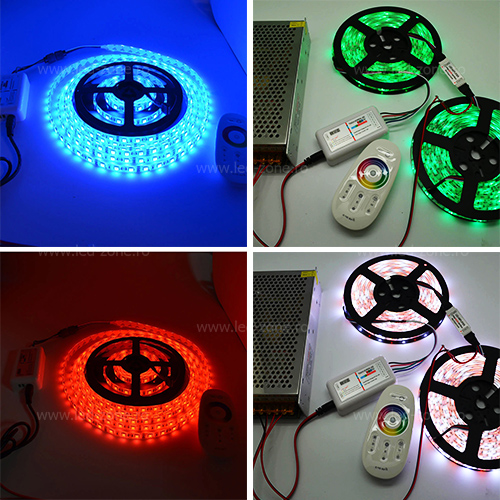 Controller-ul RGB ofera posibilitatea schimbarii culorilor si a programelor de lumini din telecomanda cu radio frecventa si control touch, prin atingere.