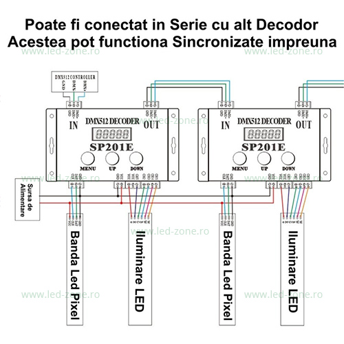 In comparatie cu alte decodoare DMX care pot decoda doar un singur tip de led, Decodorul Alitove DMX512, poate decoda atat ledurile inteligente cu pixeli adresabili, cat si ledurile RGBWW cu 5 fire. Controlerele/Decodoarele se pot conecta in linie si se pot sincroniza impreuna.