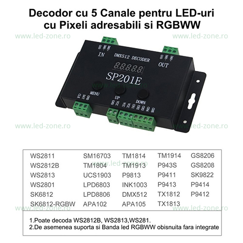 Decodor DMX512 compatibil pentru aproape toate ledurile cu circuite integrate, controlate cu ajutorul unui fir sau doua cum ar fi: WS2811, WS2812B, WS2801, SK6812, RGBW, WS2813, LPD6803, LPD8806, APA102, TM1913, UCSSM19503, DMX19503 etc.