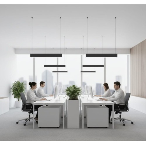 Corp de iluminat LED liniar cu montaj suspendat, conceput pentru spații de birouri, comerciale sau zone de lucru moderne. Cu un design subțire și elegant, acest corp în finisaj negru oferă un iluminat eficient și uniform, adaptat cerințelor mediilor profesionale.