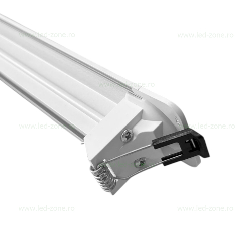 Se montează în tavan cu ajutorul clemelor incluse, asigurând o instalare rapidă și fixare sigură. Dimensiunile sunt 626 mm lungime, 45 mm lățime și 29 mm înălțime, oferind un profil discret și modern, integrabil ușor în plafoane de gips-carton sau alte suprafețe compatibile.