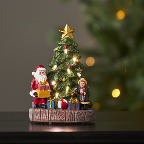 Decoraâiune detaliată, brad cu Moș Crăciun și cadouri. Strălucește frumos prin picăturile mici de rouă ale bradului. Produsul are funcții de temporizare (timmer) pentru 6h / 18h / OFF / Repetiție, ce pot fi setate din întrerupător. Este ideal pentru a obține o atmosferă minunată de Crăciun.