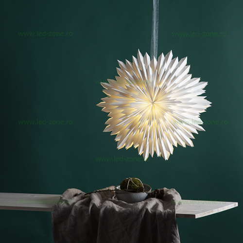 Decorațiune fantastică de hârtie albă realizată din trei straturi de hârtie șifonată și pendul E14 cu puterea max. 25W. Conturul este puțin neuniform pentru o senzație de iarnă. Este inclusă o bandă elegantă pentru a ușura agățarea decorațiunii. Ea răspândește starea de spirit și oferă casei acel sentiment special de Crăciun. Poate fi agățată pe fereastră sau pe perete.
