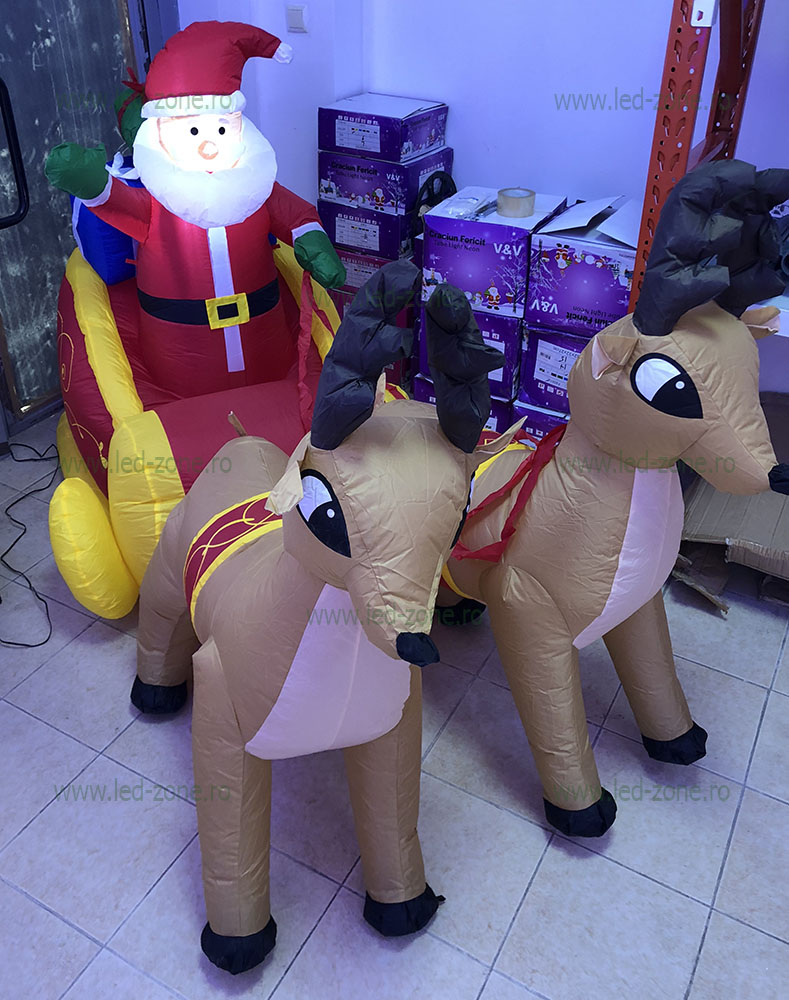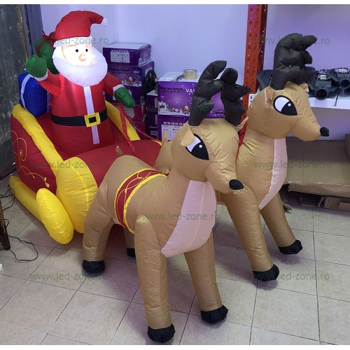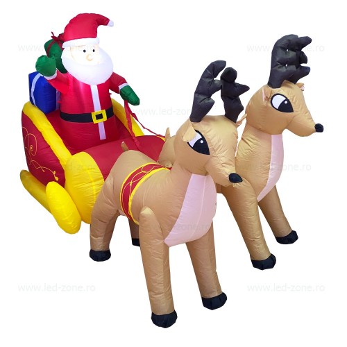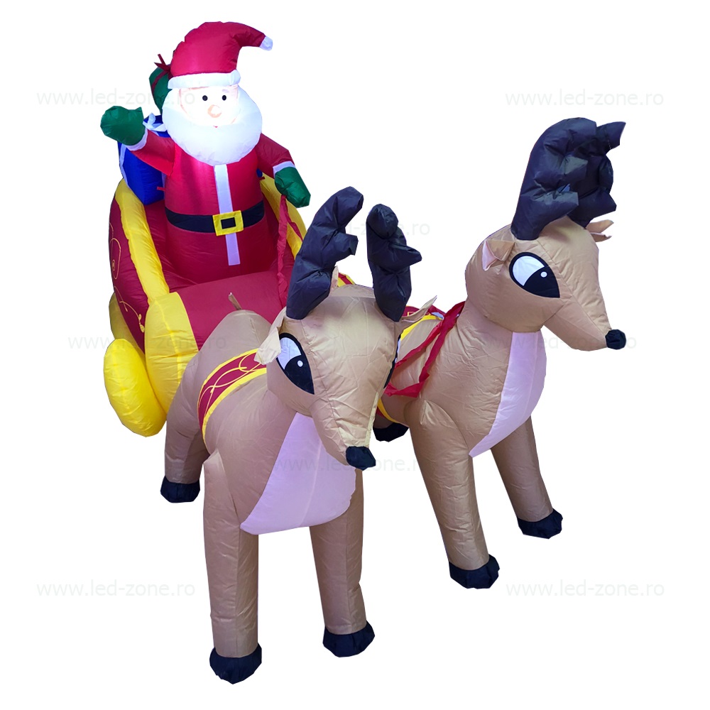 Figurina Sanie cu Reni de lungime 240cm este un obiect decorativ ideal pentru perioada sarbatorilor de iarna, este confectionat din material rezistent la intemperii, include pompa electrica cu alimentare la 220V pentru a putea fi umflat si elemente de fixare impotriva vantului.
