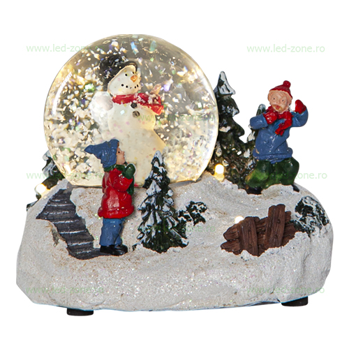 Glob de zăpadă din sticlă, iar în glob este un om de zăpadă. Afară, copiii se joacă cu zăpadă. Scuturați globul și zăpada va cădea frumos. MiniLED-urile luminează decorul. Alimentat cu două baterii AA. Funcții de temporizare (timmer) pentru 6h / 18h / OFF / Repetiție ce pot fi setate din întreupător. Este ideal pentru a obține o atmosferă minunată de Crăciun.