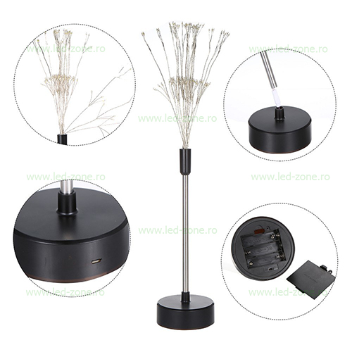 Instalatia LED Artificii are mai multe fire de cupru cu minileduri ce pot fi controlate cu ajutorul telecomenzii. Se alimenteaza cu 3 baterii AA-LR6 (nu sunt incluse) sau cu cablu USB, pe suport este prezent un port mini-usb.