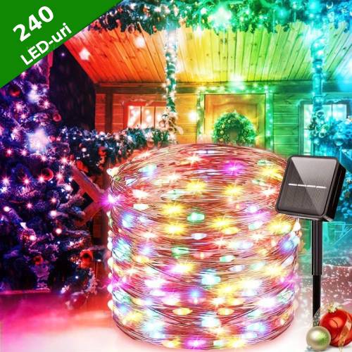 Instalatie pom Craciun 240 Leduri pentru exterior diverse culori, incarcare solara. Ideala pentru a fi montata in zonele lipsite de alimentare la 220V.