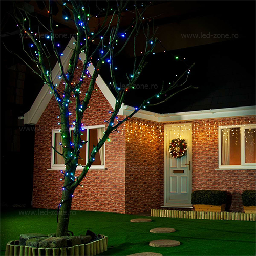 Instalatie pom Craciun 200 LED-uri interconectabila pana la 5 instalatii, poate fi folosita la interior si exterior, diverse culori, fir negru gros.|