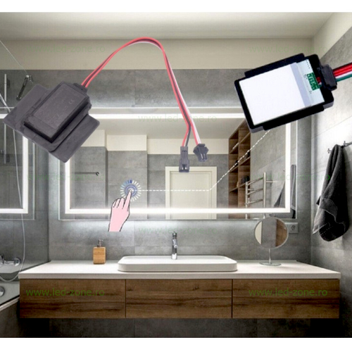 Intrerupatorul cu senzor touch este destinat controlului iluminarii LED la oglinzile de baie sau oglinzile decorative moderne. Acesta se monteaza cu usurinta pe spatele oglinzii, utilizand banda dubla adeziva, dupa marcarea precisa a pozitiei dorite. Senzorul este prevazut cu suport de fixare si cablu de alimentare cu mufe de conectare tip mama-tata, facilitand integrarea rapida in circuitul electric al sursei de lumina.