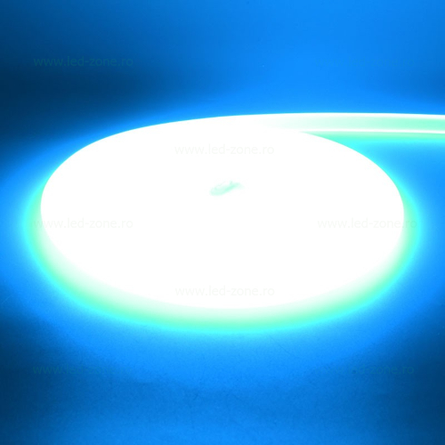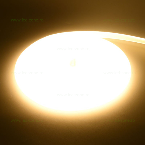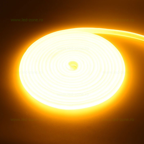Bandă LED de tip COB (Chip-on-Board), ideală pentru iluminat decorativ sau funcțional, ce oferă o lumină uniformă și continuă, fără puncte vizibile. Construcția subțire și flexibilă, împreună cu stratul de silicon mat, asigură o distribuție difuză a luminii și o protecție sporită împotriva umezelii și a prafului.