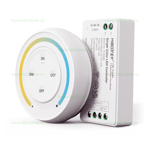 Pachetul contine 5 metri de banda dual white, 1 controller CCT cu telecomanda touch de perete si 1 transformator 72W cu carcasa de plastic.