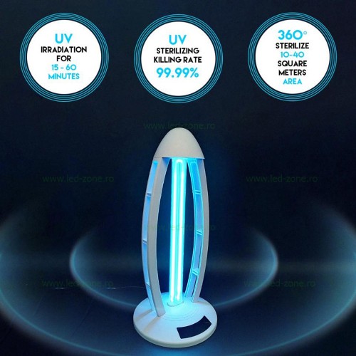 Lampa cu dubla sterilizare, UVC si Ozon, are putere 38W si este solutia perfecta pentru dezinfectarea completa a aerului si a suprafetelor din incaperi, avand un unghi de actiune de 360 grade ce poate acoperi suprafete de pana la 60mp.