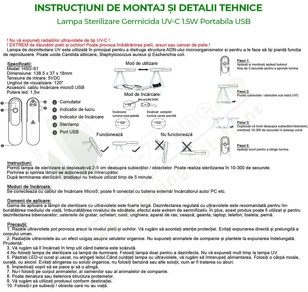 Specificatii Lampa Sterilizare Germicida UV-C 1.5W Portabila USB
