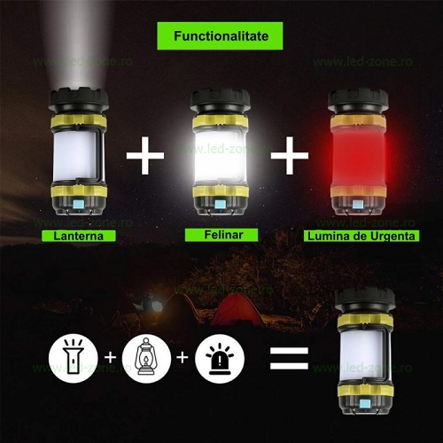 Sau in mod lampa cu iluminare 360˚ , avand lumina alba 50% si 25% , ori lumina rosie cu doua moduri statica sau intermitenta.