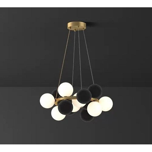 Lustra aplicată aurie cu 16 globuri albe si negre din sticlă mata este un corp de iluminat modern, ideal pentru interioare contemporane.