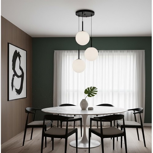 Lustra modernă suspendată cu trei globuri mate se remarcă printr-un design elegant și contemporan.