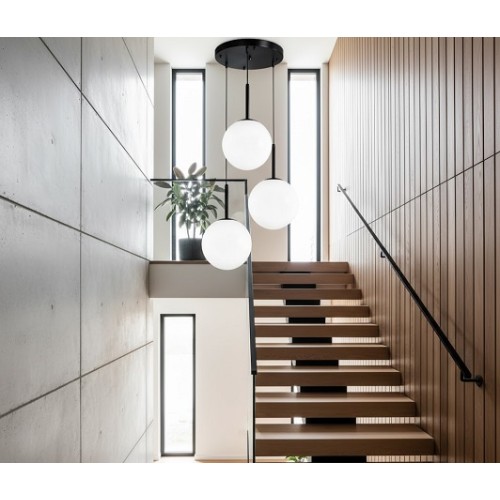 Cele trei abajururi mate oferă o lumină difuză și plăcută, potrivită pentru crearea unei atmosfere confortabile.