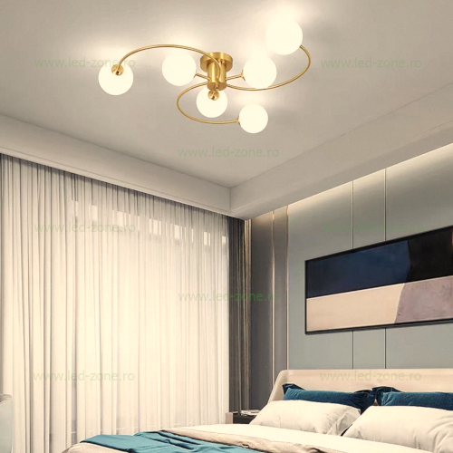 Lustra aplicată aurie cu 6 globuri din sticlă mata este un corp de iluminat modern, ideal pentru interioare contemporane. Designul său elegant combină finisajele metalice cu sticla mata, oferind un efect vizual rafinat și cald. Este prevăzută cu 6 fasunguri tip E27, compatibile cu o gamă variată de becuri LED. Dispune de o montare aplicată, fiind potrivită pentru livinguri, dormitoare sau zone de dining. Această lustra nu doar iluminează eficient spațiul, ci contribuie și la decorul general printr-un aspect sofisticat și modern.