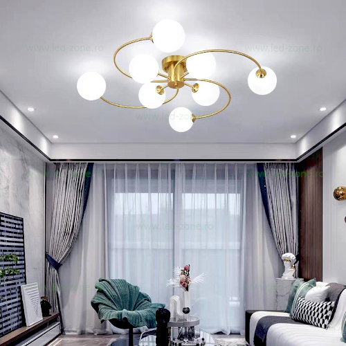 Lustra aplicată aurie cu 8 globuri din sticlă mata este un corp de iluminat modern, ideal pentru interioare contemporane. Designul său elegant combină finisajele metalice cu sticla mata, oferind un efect vizual rafinat și cald. Este prevăzută cu 8 fasunguri tip G9, compatibile cu o gamă variată de becuri LED. Dispune de o montare aplicată, fiind potrivită pentru livinguri, dormitoare sau zone de dining. Această lustra nu doar iluminează eficient spațiul, ci contribuie și la decorul general printr-un aspect sofisticat și modern.