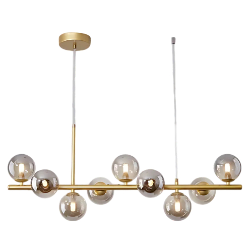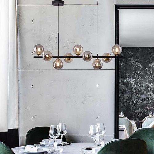 Lustra 9 globuri cu sticla fumurie si socluri G9 model LZ2414-9 este o alegere elegantă pentru interioare moderne. Cu un design contemporan în finisaj negru, se integrează ușor în living, dining sau chiar spații comerciale cu stil. Structura sa are dimensiunile de 300×900x800 mm, ceea ce o face potrivită pentru a fi montată deasupra unei mese sau în centrul unei încăperi, devenind un element de atracție vizuală.