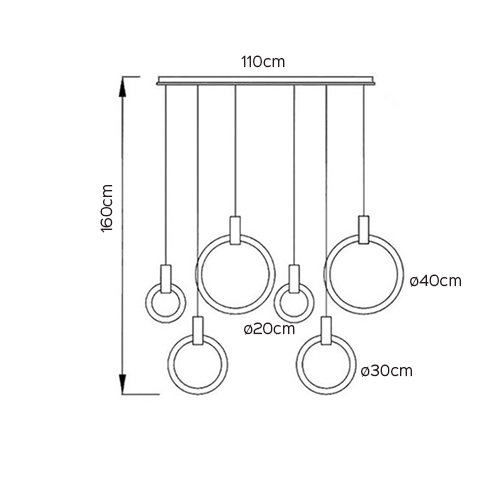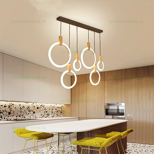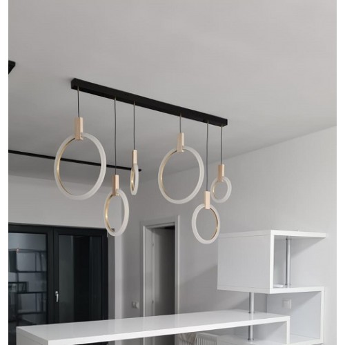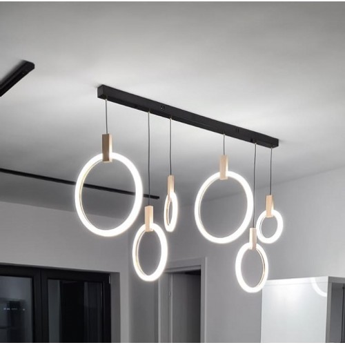 Lustra LED cu sase inele suspendate impresioneaza prin designul sau modern si prin capacitatea de iluminare puternica, ideala pentru incaperi spatioase. Realizata din aluminiu si PC, cu suport in nuanta neagra, combina eleganta minimalista cu functionalitatea avansata. Cele sase inele sunt dispuse pe doua niveluri (2x80W), oferind un efect vizual spectaculos si un flux luminos ridicat, intre 60 si 80lm/W.