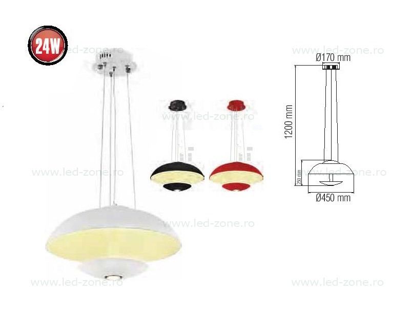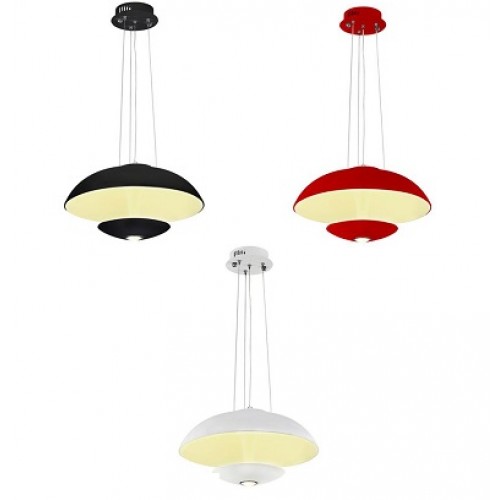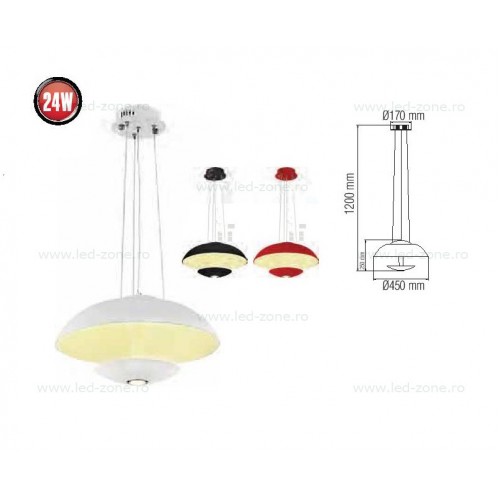 Lustra LED rotunda suspendata ofera lumina Alb Natural, are diverse culori (negru, alb, rosu) si design modern.