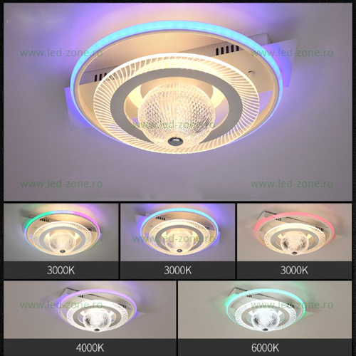 Lustra cu LED 3 functii va permite schimbarea din telecomanda a nuantelor de lumina intre alb cald, alb natural alb rece si RGB si a intensitatii luminii (dimabil).