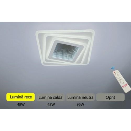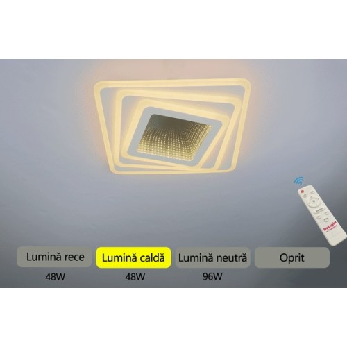Lustra cu LED 3 functii va permite schimbarea din telecomanda a nuantelor de lumina intre alb cald, alb natural si alb rece si a intensitatii luminii (dimabil).