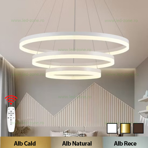 Lustra LED este solutia perfecta pentru un iluminat ambiental, modern si foarte placut, oferind trei nuante de lumina alb cald, natural, rece, ce pot fi schimbate cu ajutorul telecomenzii sau din intrerupator.