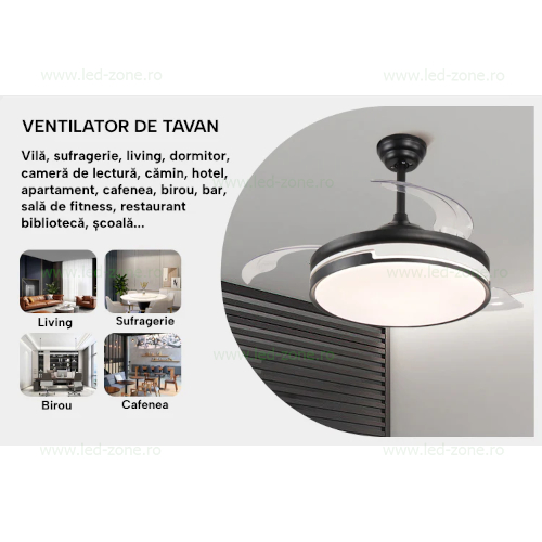 - ✅ Ventilator retractabil: Paletele transparente se extind automat în timpul funcționării și se retrag discret atunci când nu este utilizat, oferind un aspect elegant de plafonieră.