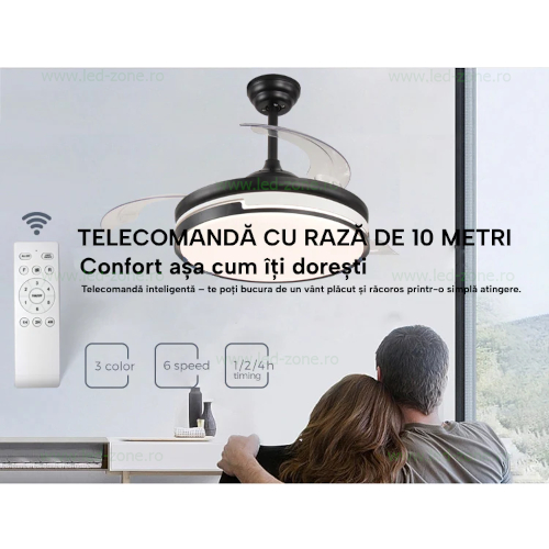 Lustra LED cu Ventilator si Telecomanda ofera 3 nuante de lumina alba (cald, natural, rece)