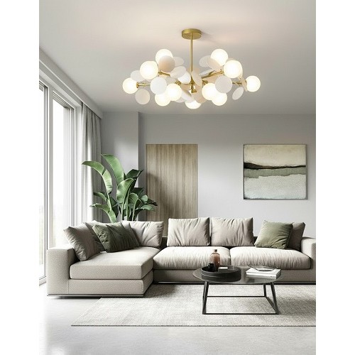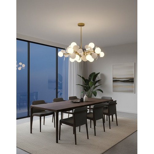 Este echipată cu 10 socluri E27, oferind posibilitatea de a alege tipul de becuri LED preferat pentru a crea atmosfera dorită. Becurile nu sunt incluse.