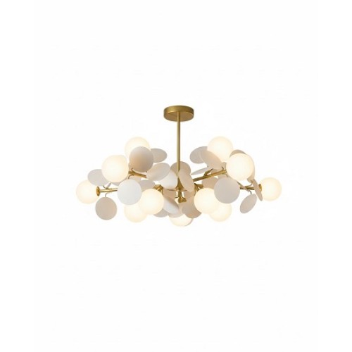 Realizată într-un finisaj auriu rafinat, cu ornamente albe, lustra se integrează perfect în interioare contemporane sau minimaliste.