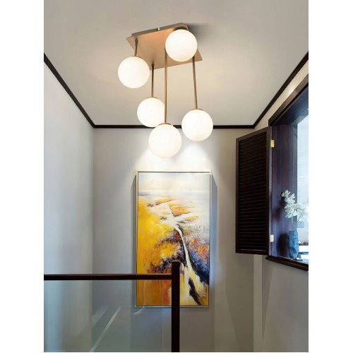 Este realizată din metal și plastic, în culoarea auriu sau negru mat, oferind un aspect sobru și versatil, ușor de integrat în diferite stiluri de amenajare. Funcționează cu 5 becuri de tip G9 (neincluse în pachet), oferind o lumină suficientă pentru spații de dimensiuni mici și medii.