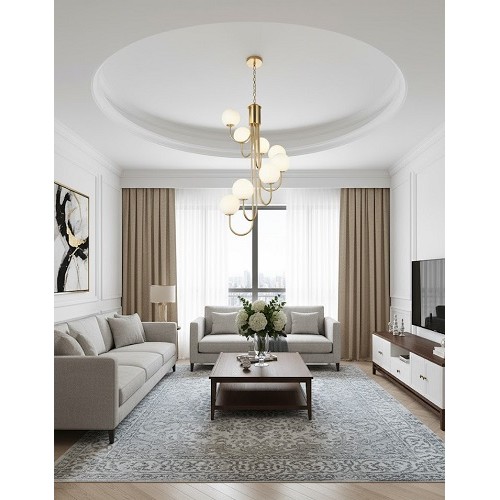 Cu dimensiuni de mm, lustra are un format suspendat care pune în valoare înălțimea camerei, devenind un element decorativ central.