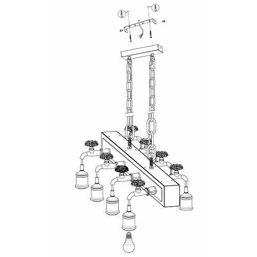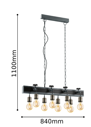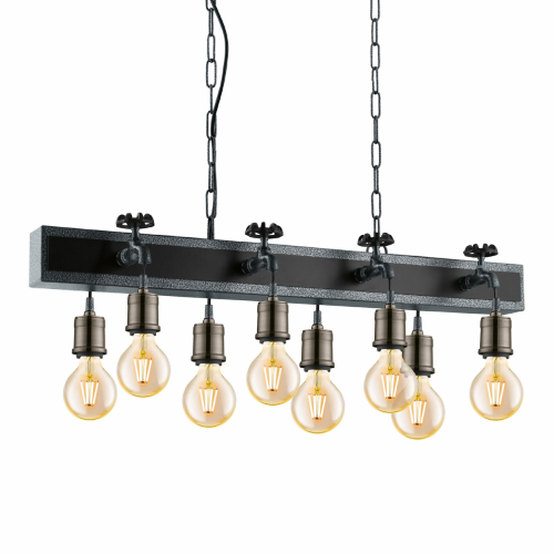 Acest corp de iluminat cu pandantiv din seria GOLDCLIFF este realizat din lemn, argintiu antic, oțel negru și bronzat. Pentru iluminare sunt necesare opt iluminatoare E27, în mod ideal filamente LED din colecția vintage.