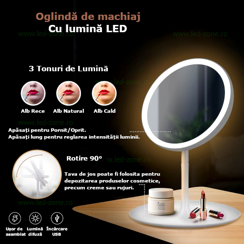 Descriere Oglinda Machiaj LED 5W 3 Functii USB Alba