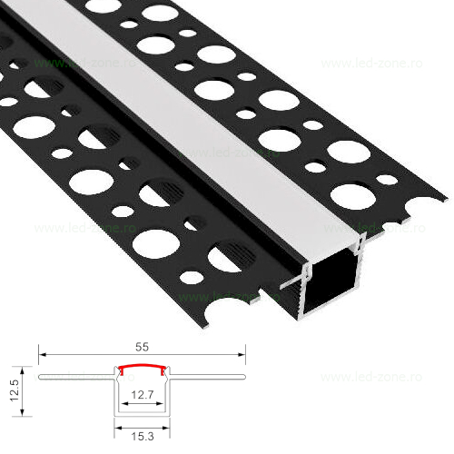 Descriere Profil Aluminiu Incastrat Sub Tencuiala Negru Dispersor Alb 2M 12.7MM